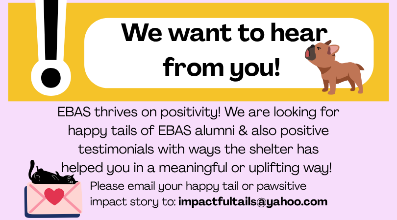The Eva Burrell Animal Shelter (EBAS) believes that it has the ability and power to effect change one animal at a time. It is our goal to be worthy of their lives, to be enriched by their presence, and to not miss the lessons they teach. We pledge to educate, to lead by example, to learn, to help when and where we can, to be diligent in our fundraising, and to be worthy of the trust placed in us.